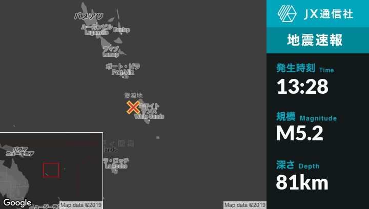 6月14日 13:28頃、バヌアツのIsangelから北北西92kmの地点でM5.2の地震がありました。