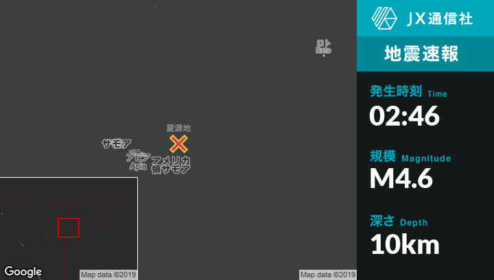 6月15日 02:46頃、アメリカ領サモアのAuaから北北東87kmの地点でM4.6の地震がありました。