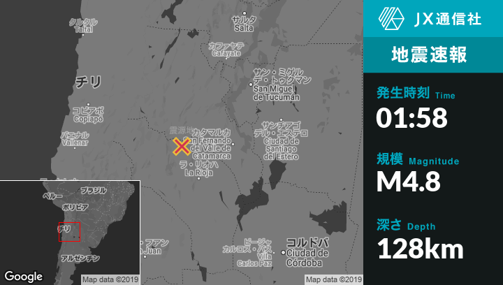 震源地アルゼンチンのTinogastaから南南東43kmの地点
