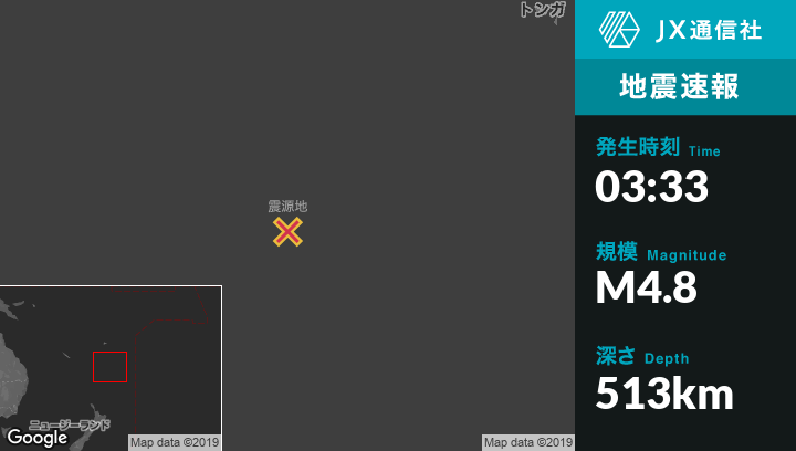 6月16日 03:33頃、ニュージーランドのRaoul Islandから北北西517kmの地点でM4.8の地震がありました。