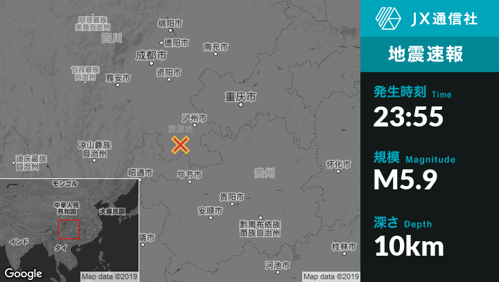 6月17日 23:55頃、中国のChangningから南南東19kmの地点でM5.9の地震がありました。