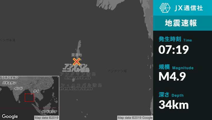 6月18日 07:19頃、インドのBamboo Flatから北44kmの地点でM4.9の地震がありました。
