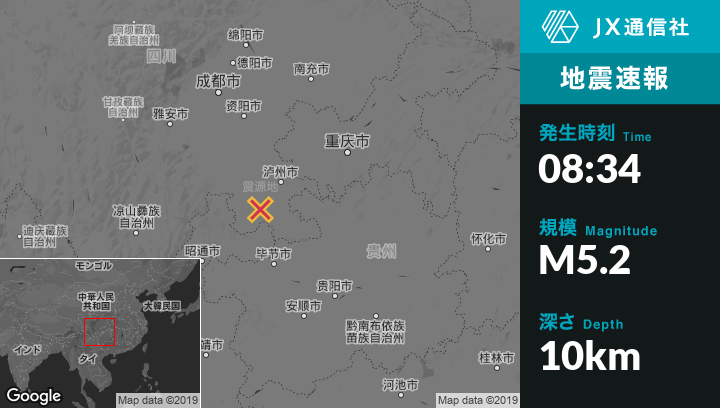 6月18日 08:34頃、中国のChangningから南南東15kmの地点でM5.2の地震がありました。
