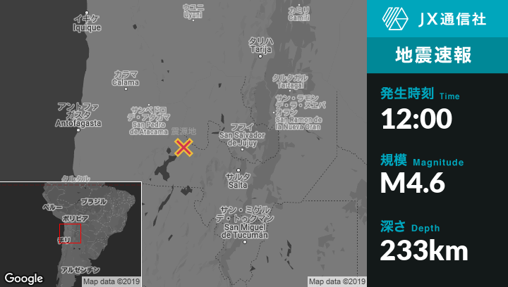 震源地アルゼンチンのSan Antonio de los Cobresから西北西84kmの地点