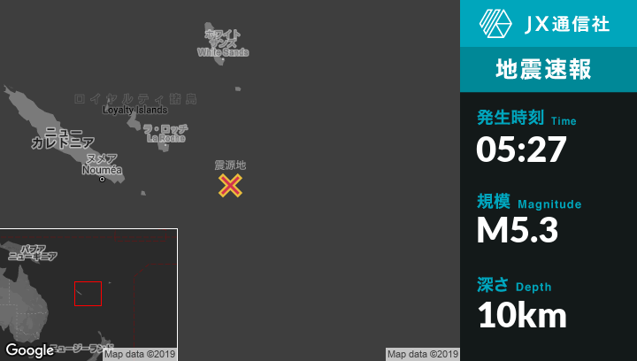 6月19日 05:27頃、ニューカレドニアのTadineから東南東198kmの地点でM5.3の地震がありました。