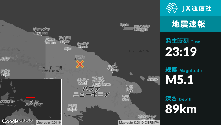 6月19日 23:19頃、パプアニューギニアのAmbuntiから東南東73kmの地点でM5.1の地震がありました。