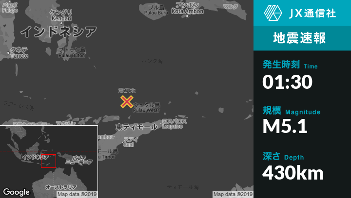 6月21日 01:30頃、東ティモールのDiliから北128kmの地点でM5.1の地震がありました。