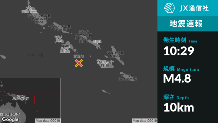 6月22日 10:29頃、ソロモン諸島のDadaliから南南西176kmの地点でM4.8の地震がありました。