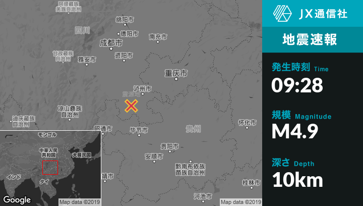 6月23日 09:28頃、中国のChangningから南南東7kmの地点でM4.9の地震がありました。