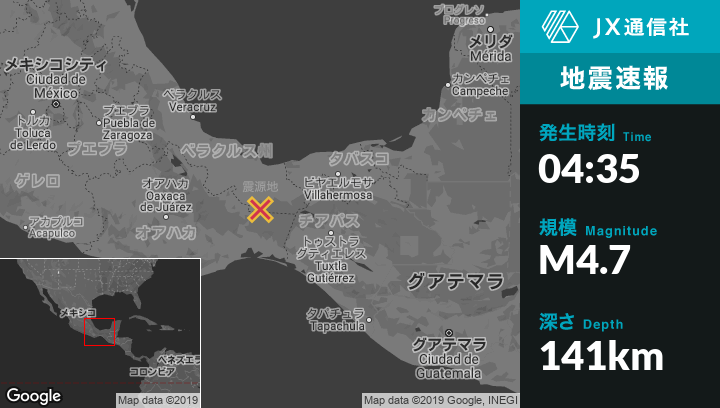 6月24日 04:35頃、メキシコのJesus Carranzaから東南東41kmの地点でM4.7の地震がありました。