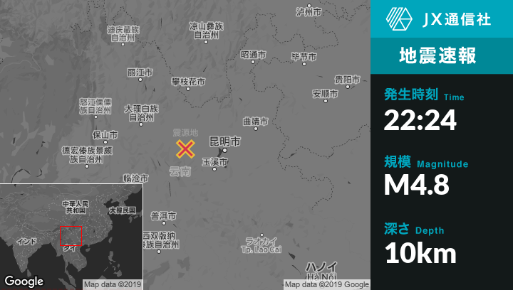 6月24日 22:24頃、中国のGongheから南南東27kmの地点でM4.8の地震がありました。