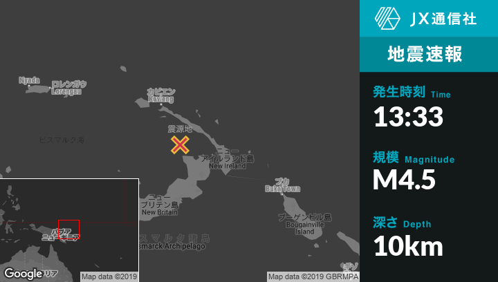 7月28日 13:33頃、パプアニューギニアのRabaulから西北西97kmの地点でM4.5の地震がありました。