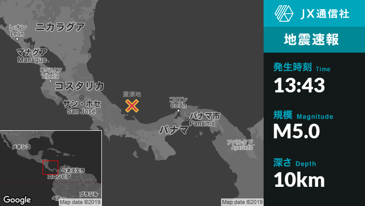 7月29日 13:43頃、パナマのIsla Bastimentosから北北東47kmの地点でM5.0の地震がありました。