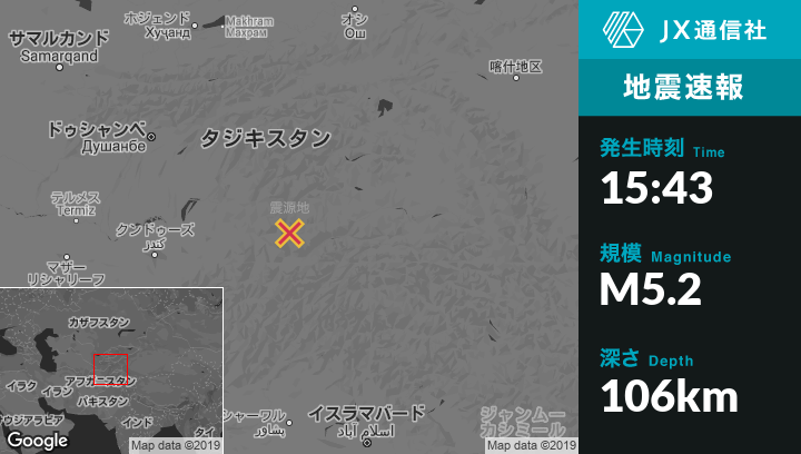 8月10日 15:43頃、タジキスタンのRoshtqal'aから西南西29kmの地点でM5.2の地震がありました。