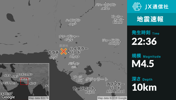 8月12日 22:36頃、パキスタンのJamshoroから西北西41kmの地点でM4.5の地震がありました。