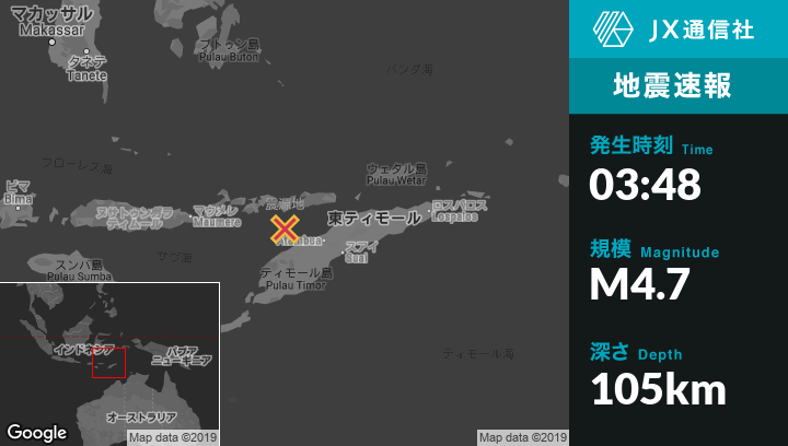 震源地インドネシアのKefamenanuから北北西87kmの地点