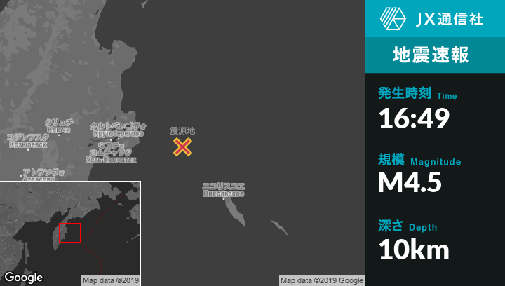 8月16日 16:49頃、ロシアのNikol'skoyeから北西136kmの地点でM4.5の地震がありました。