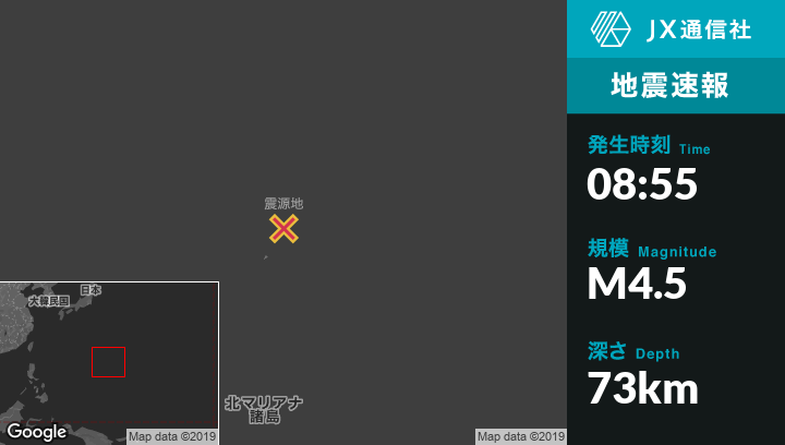 8月18日 08:55頃、北マリアナ諸島のAgrihanから東47kmの地点でM4.5の地震がありました。