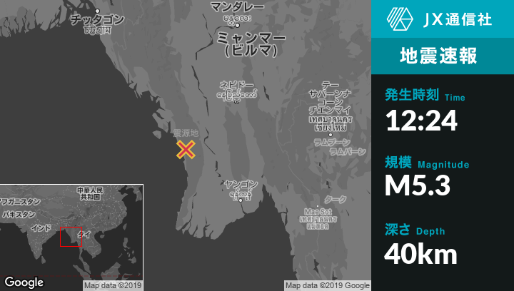 8月18日 12:24頃、ミャンマーのPromeから西南西82kmの地点でM5.3の地震がありました。