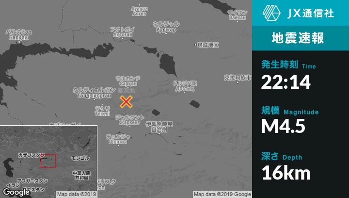 8月19日 22:14頃、カザフスタンのSarkandから南41kmの地点でM4.5の地震がありました。
