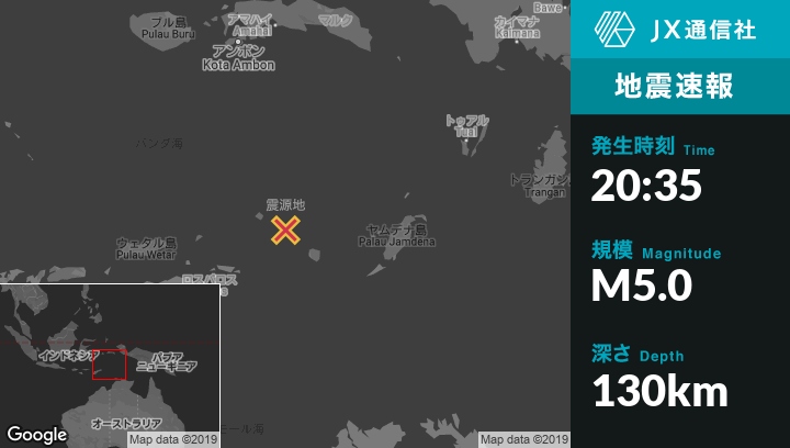 8月20日 20:35頃、インドネシアのSaumlakiから西北西252kmの地点でM5.0の地震がありました。