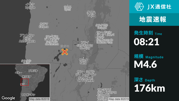 8月21日 08:21頃、アルゼンチンのSan Antonio de los Cobresから西76kmの地点でM4.6の地震がありました。