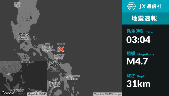 9月21日 03:04頃、フィリピンのVigaから東北東19kmの地点でM4.7の地震がありました。