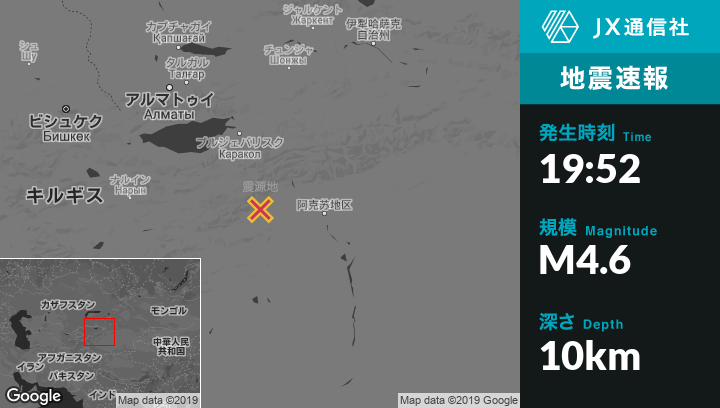 10月27日 19:52頃、中国のAksuから西122kmの地点でM4.6の地震がありました。