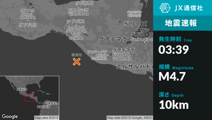 | 震源地 | メキシコのPuerto Maderoから南西89kmの地点 |