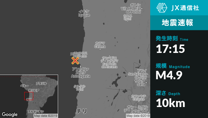 10月29日 17:15頃、チリのAntofagastaから北西70kmの地点でM4.9の地震がありました。
