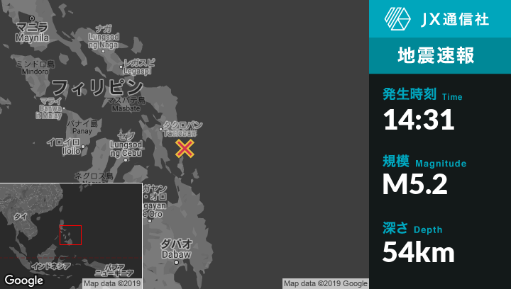 11月08日 14:31頃、フィリピンのSulanganから南西21kmの地点でM5.2の地震がありました。