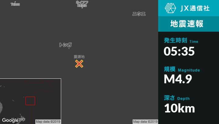 | 震源地 | トンガの`Ohonuaから南東132kmの地点 |
