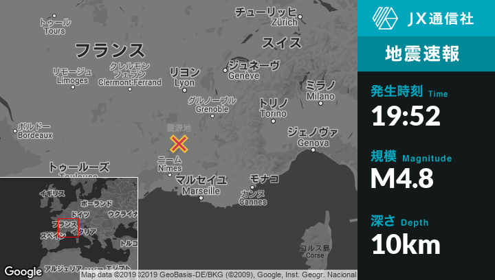| 震源地 | フランスのMeysseから西北西5kmの地点 |