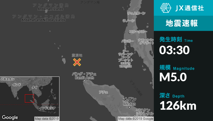 | 震源地 | インドネシアのSabangから北北西139kmの地点 |