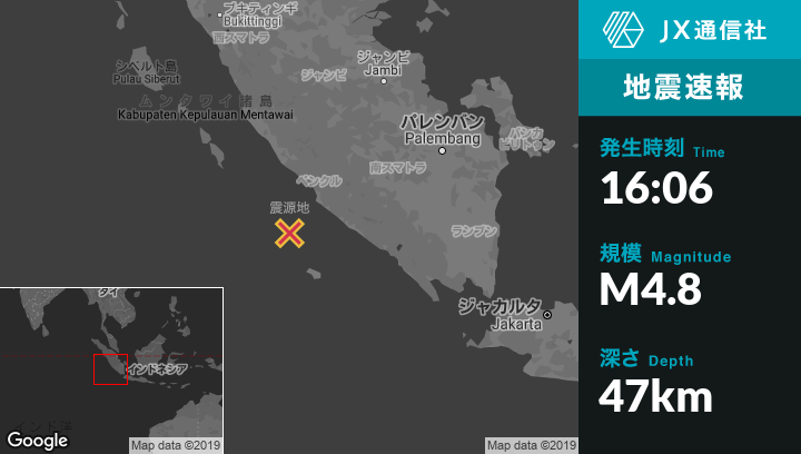 | 震源地 | インドネシアのBengkuluから南西92kmの地点 |