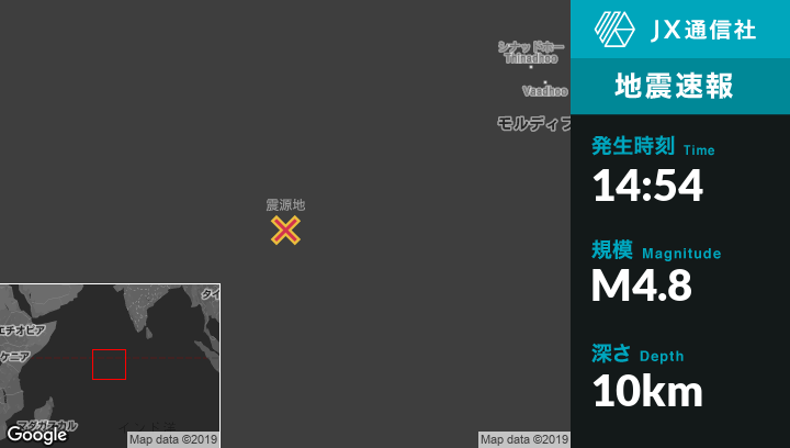 | 震源地 | モルディブのHithadhooから西南西599kmの地点 |