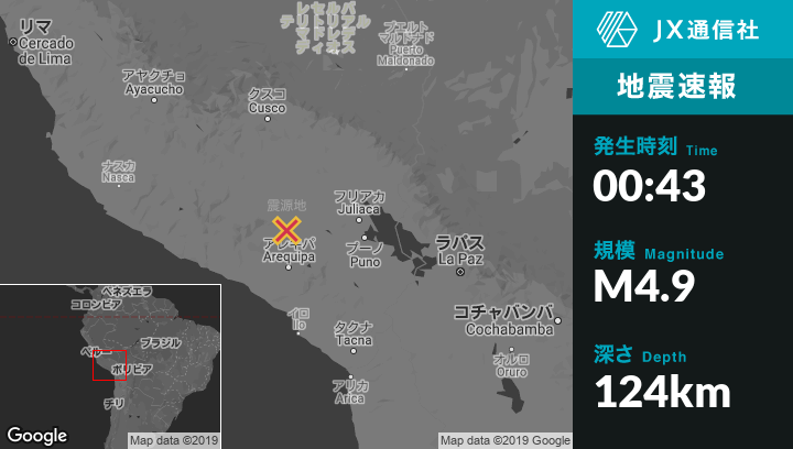 12月10日 00:43頃、ペルーのChivayから北5kmの地点でM4.9の地震がありました。