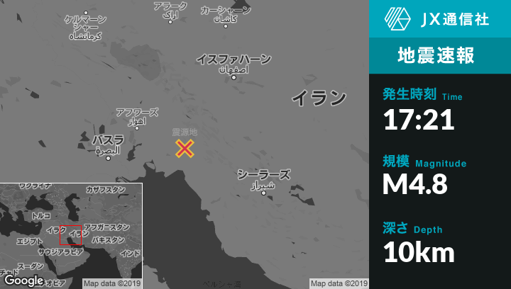 12月10日 17:21頃、イランのBehbahanから北北西33kmの地点でM4.8の地震がありました。