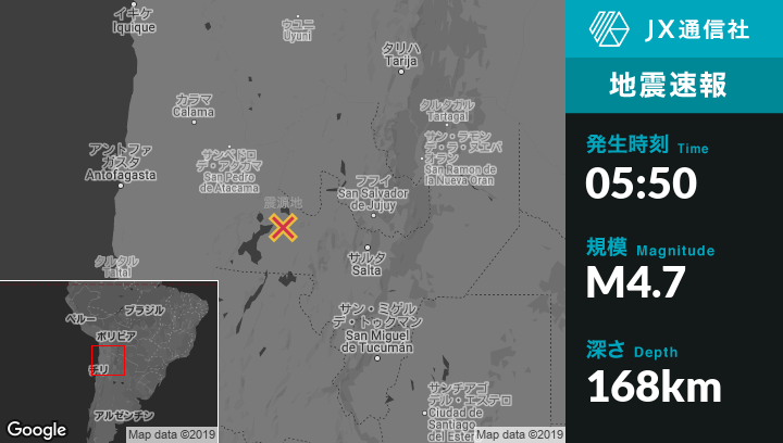 | 震源地 | アルゼンチンのSan Antonio de los Cobresから西82kmの地点 |
