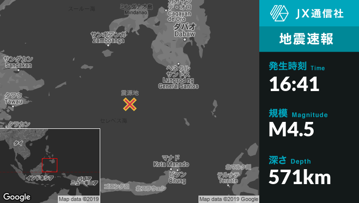 12月16日 16:41頃、フィリピンのTabiauanから南東215kmの地点でM4.5の地震がありました。