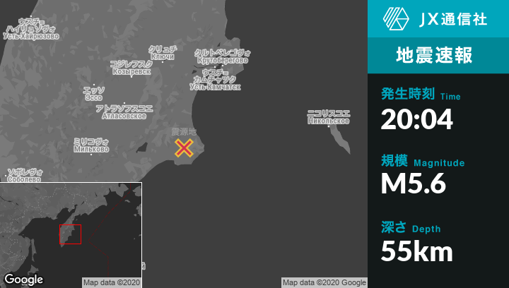 1月22日 20:04頃、ロシアのUst'-Kamchatsk Staryyから南南西162kmの地点でM5.6の地震がありました。