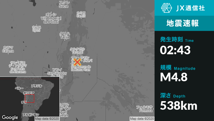 | 震源地 | アルゼンチンのGeneral Enrique Mosconiから南35kmの地点 |