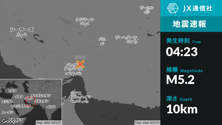 1月23日 04:23頃、イランのMinabから北北西101kmの地点でM5.2の地震がありました。