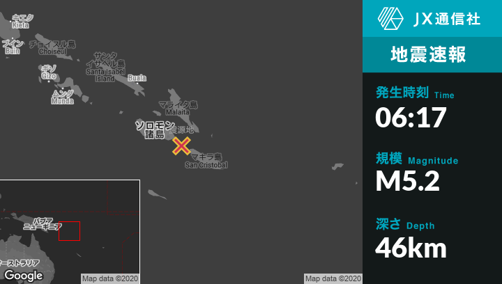 2月26日 06:17頃、ソロモン諸島のKirakiraから西北西112kmの地点でM5.2の地震がありました。