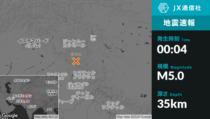 2月27日 00:04頃、インドのChambaから北北東50kmの地点でM5.0の地震がありました。