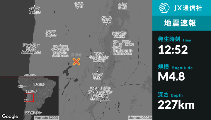 | 震源地 | アルゼンチンのSan Antonio de los Cobresから西北西76kmの地点 |