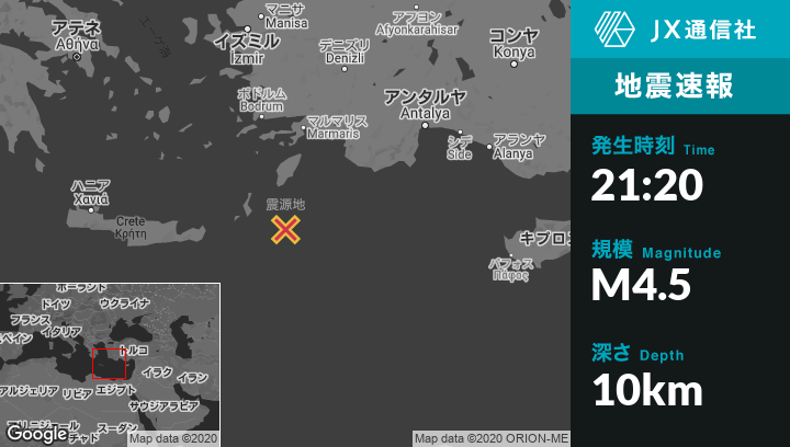 2月27日 21:20頃、ギリシャのKarpathosから東南東67kmの地点でM4.5の地震がありました。