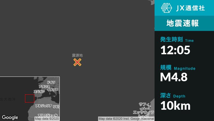 2月29日 12:05頃、ポルトガルのCamachaから北東273kmの地点でM4.8の地震がありました。
