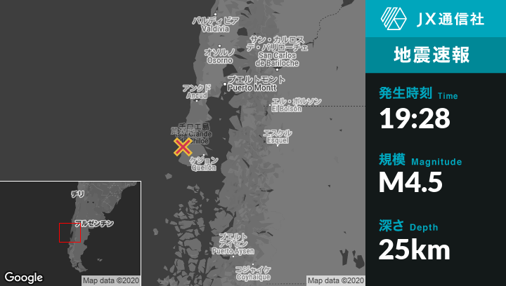 3月07日 19:28頃、チリのChonchiから南西45kmの地点でM4.5の地震がありました。