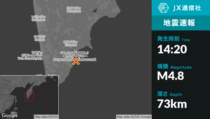 3月12日 14:20頃、ロシアのVilyuchinskから南東41kmの地点でM4.8の地震がありました。